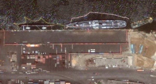 這張來自於Google Earth的衛星照片拍攝於2016年5月,有軍事專家指出,照片中浮在水面上的船隻(左上)似乎是中國最新的核子潛艇。(圖截自推特)