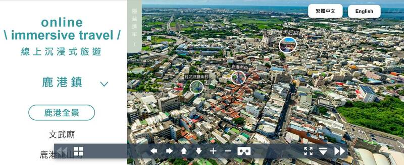 沈浸式旅遊平台,採用空拍環景技術,提供720度全景視野,上下左右盡覽鹿港美景。(圖縣府提供)