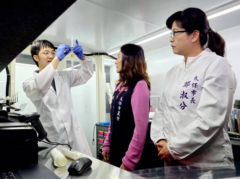 太保市長鄭淑分(右)、太保市農會總幹事黃靜玉(中)瞭解檢驗過程。(太保市公所提供)