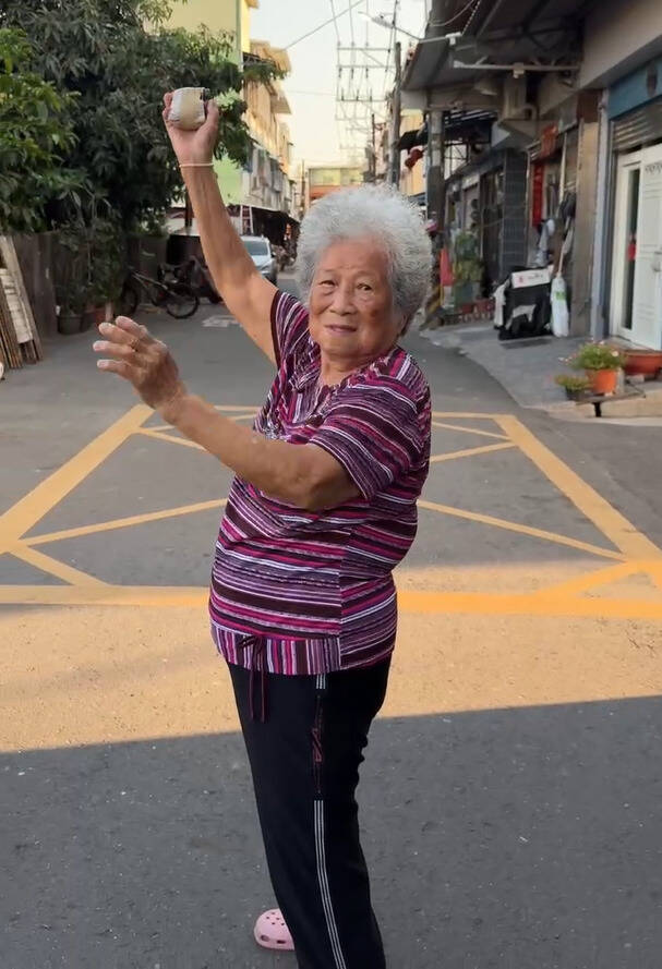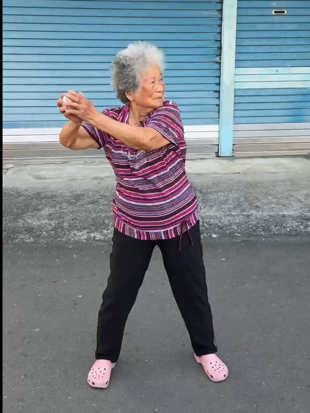 90歲大港阿媽投球姿勢越來越熟練。(圖由大港阿媽孫女提供)