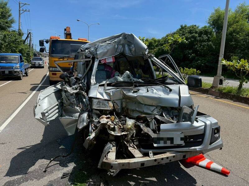 台1線苗栗縣後龍路段,10日發生廂型車誤闖施工區撞上大貨車事故,廂型車車頭右側塞入大貨車尾。(警方提供)