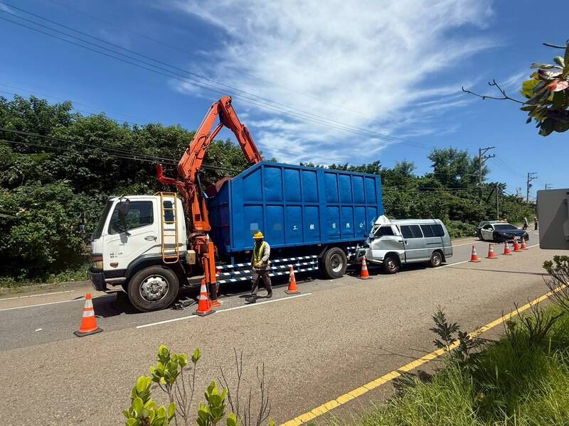 台一線苗栗後龍段廂型車誤闖施工區 車頭塞入大貨車屁股