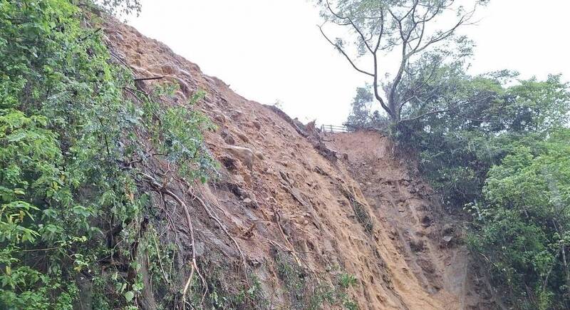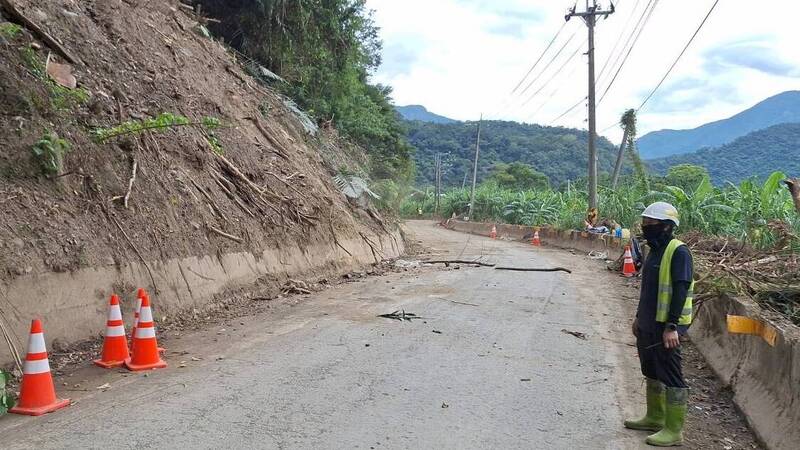 台21線76.75k頂崁路段,上邊坡土石滑落,9月15日至10月17日止將交管。(公路局信義工務提供)