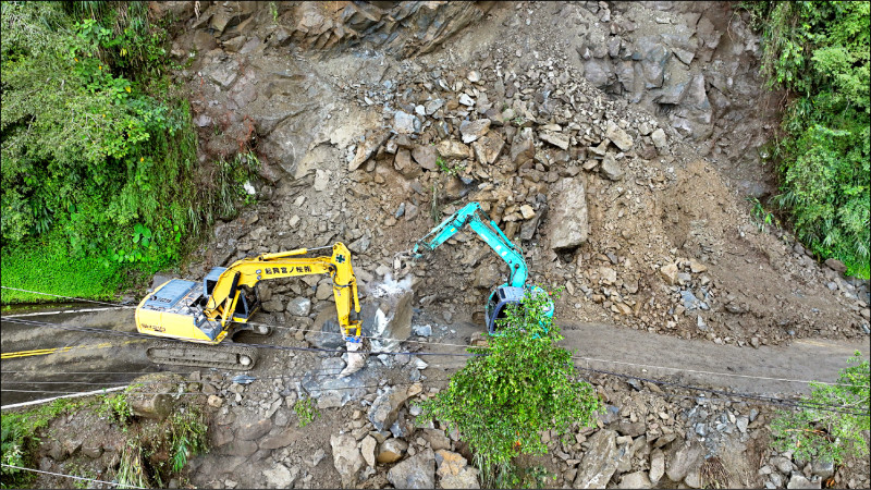 杉林溪聯外道路崩坍,南投縣政府派出機具緊急搶修。(杉林溪園區提供)