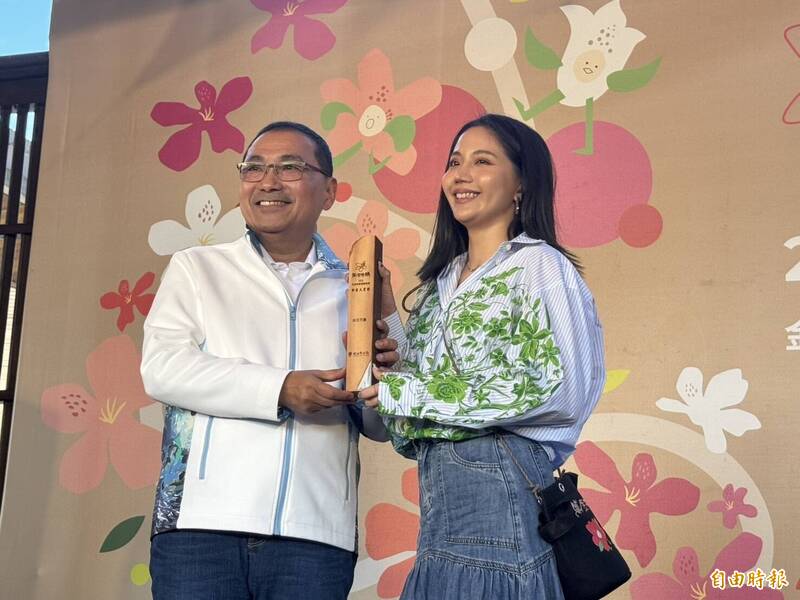 新北市長侯友宜頒發萬金杜鵑園藝景觀競賽評審大獎,由浪花花藝陳艾琳與利和苗圃游金和共同創作的「門前」榮獲大獎。(記者羅國嘉攝)