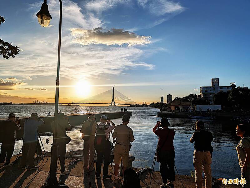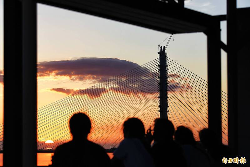從淡水滬尾漁港拍攝淡江大橋夕陽,完全不會被橋的主塔遮蔽。(記者吳亮儀攝)