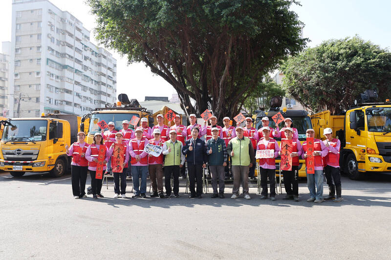 農曆年前最後1個上班日,市長黃偉哲與工務局長陳世仁(前中、右)到第1工務大隊北門辦公室慰問第1線工務人員。(市府提供)