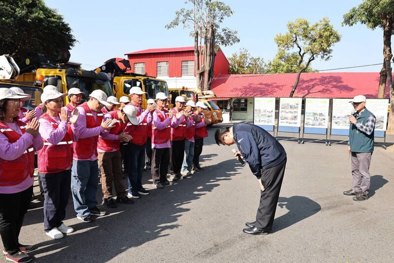 市長黃偉哲(右)鞠躬向第1線工務人員長期堅守崗位表達感謝之意。(市府提供)