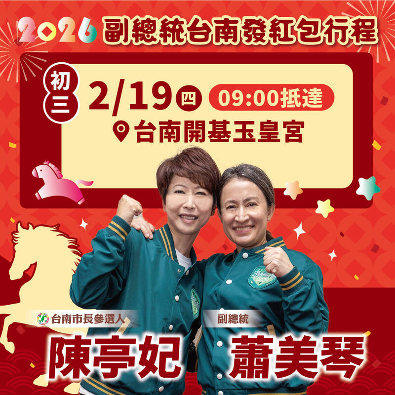 〔記者王捷/台南報導〕民進黨立委陳亭妃在贏得下一屆市長黨內初選後,公布賴清德總統、蕭美琴副總統春節到台南發放福袋行程,賴將在2月17日到麻豆代天府、2月18日清晨到祀典武廟,蕭則2月19日前往開基玉皇宮。