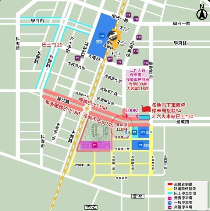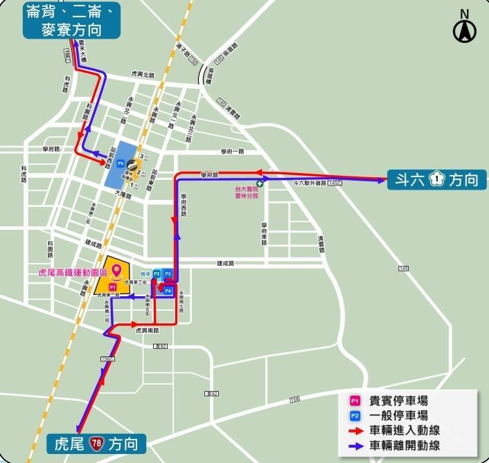 汪令堯指出,民眾屆時能將車輛停放在P2至13停車場,此外整個虎尾高鐵特定區車行動線採用進離場分流,讓各地民眾各走不同道路,達到行車方便。此外將在P5停車場、高鐵雲林站3號出口、斗六火車站規劃接駁車,詳細交通動線會持續滾動式調整,近期將公布於官網。