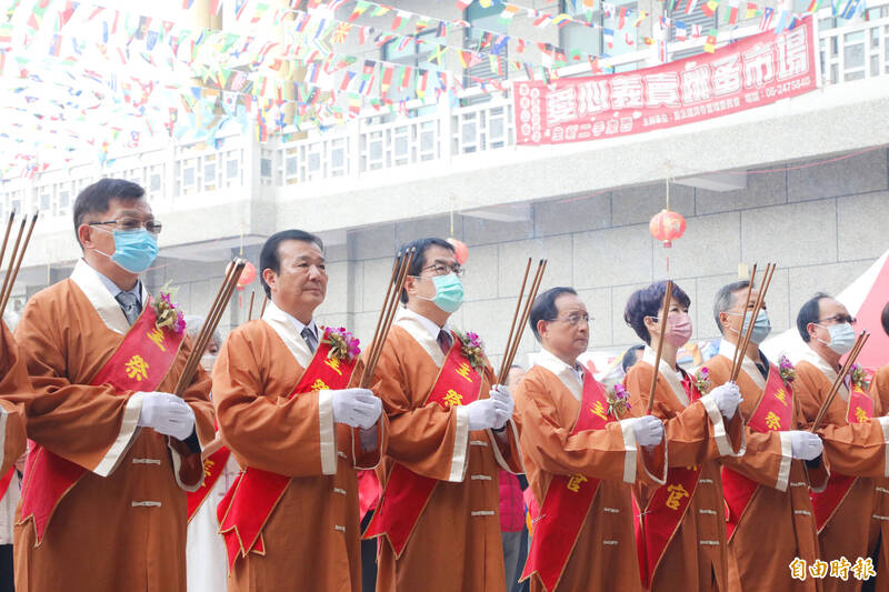 市長黃偉哲(左3)等人出席普法道濟寺濟公活佛誕辰祝壽儀式。(記者王姝琇攝)