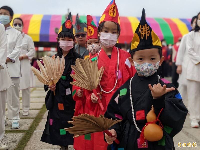 安南區普法道濟寺今日舉辦濟公活佛拜壽大典,學童巧扮小濟公活佛演出。(記者王姝琇攝)