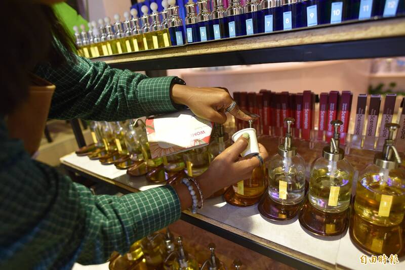 新加坡聖淘沙內開設「Sentopia」香水店,店員詳細介紹如何從120種香味中挑選喜愛的味道來自製香水。(記者吳柏軒攝)