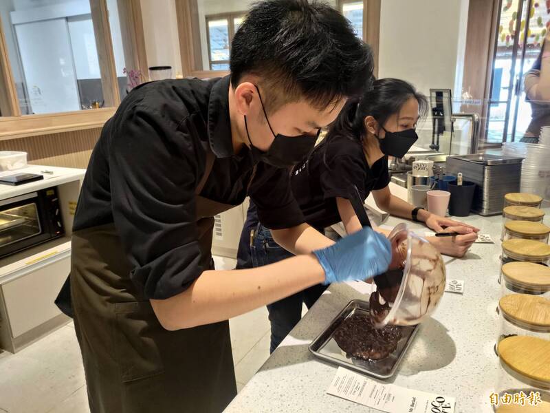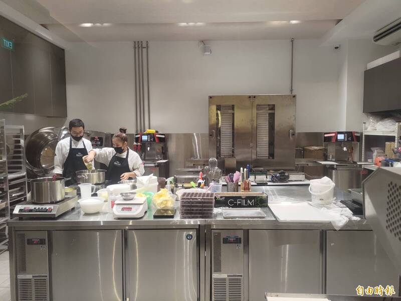 新加坡巧克力工廠「Mr. bucket」店內將廚房敞開,讓遊客可直接觀看師傅巧克力製作的過程。(記者吳柏軒攝)