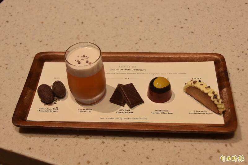 新加坡巧克力工廠「Mr. bucket」推出巧克力品嘗套餐,包含多元巧克力產品,從最左側的可可豆,到可可豆薄殼製成的特色飲品,接著是65%濃度巧克力,以及帶走糖薪的巧克力塊,最後是撒上巧克力碎片的餅乾,讓味覺與各種不同的巧克力元素碰撞。(記者吳柏軒攝)