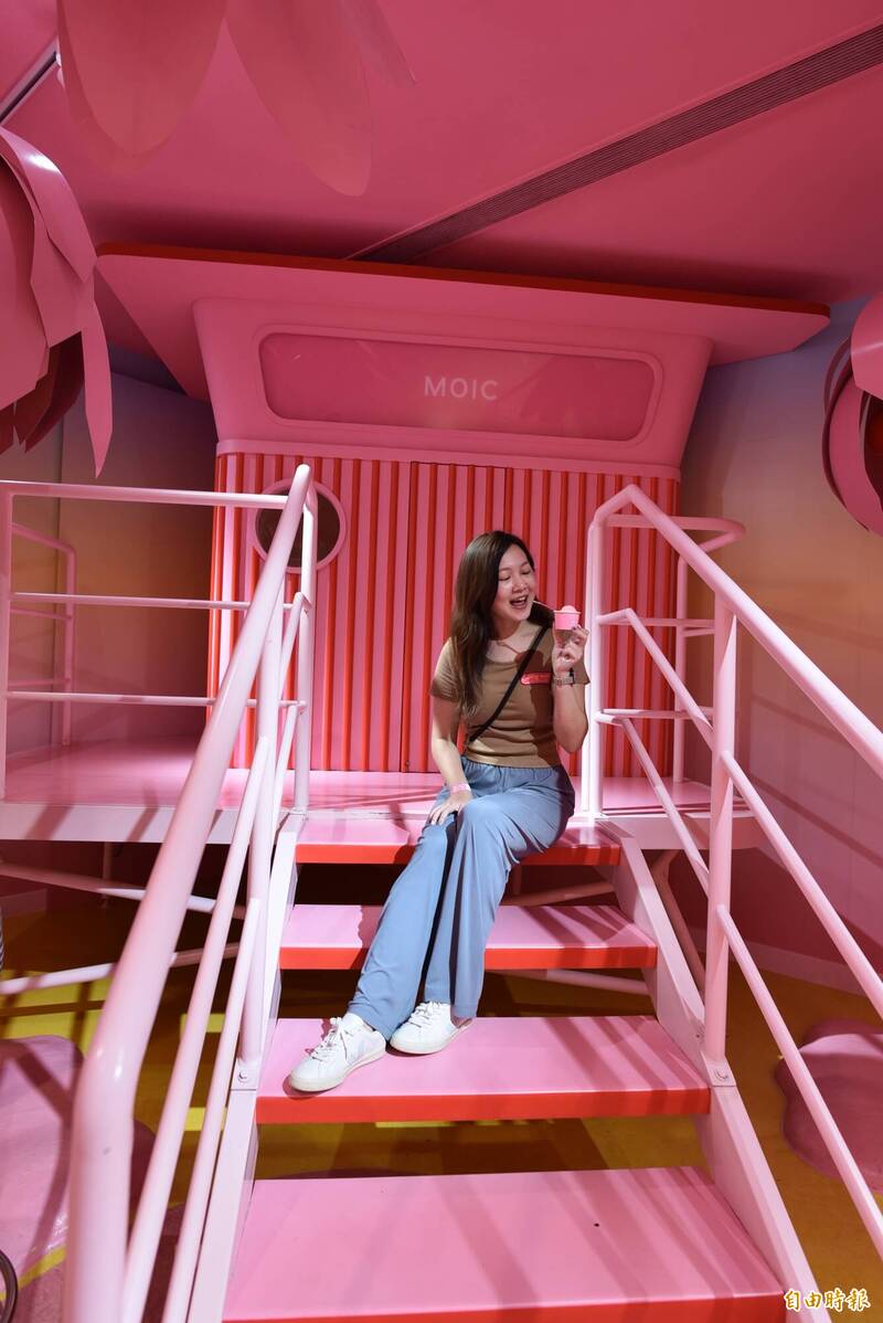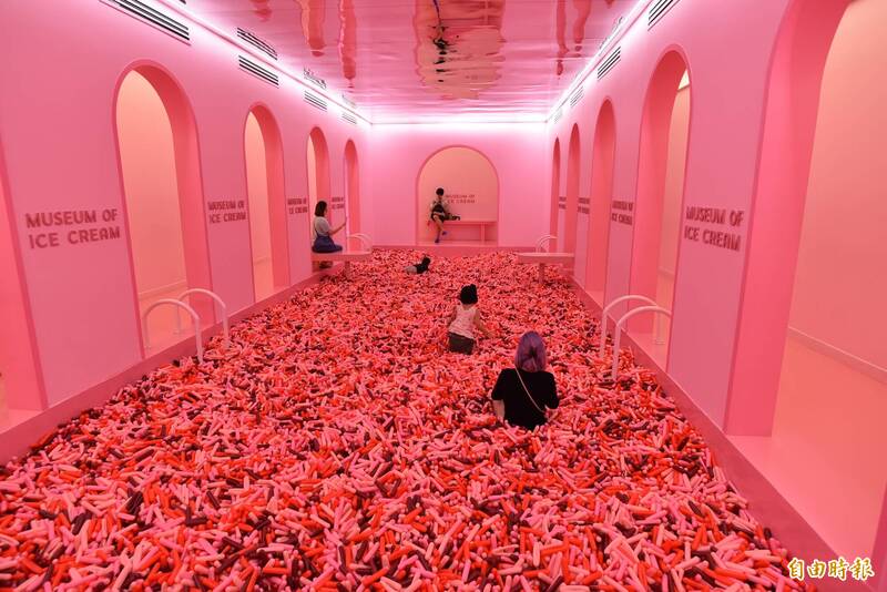 新加坡冰淇淋博物館內充滿粉紅風暴,適合網美拍照打卡。(記者吳柏軒攝)