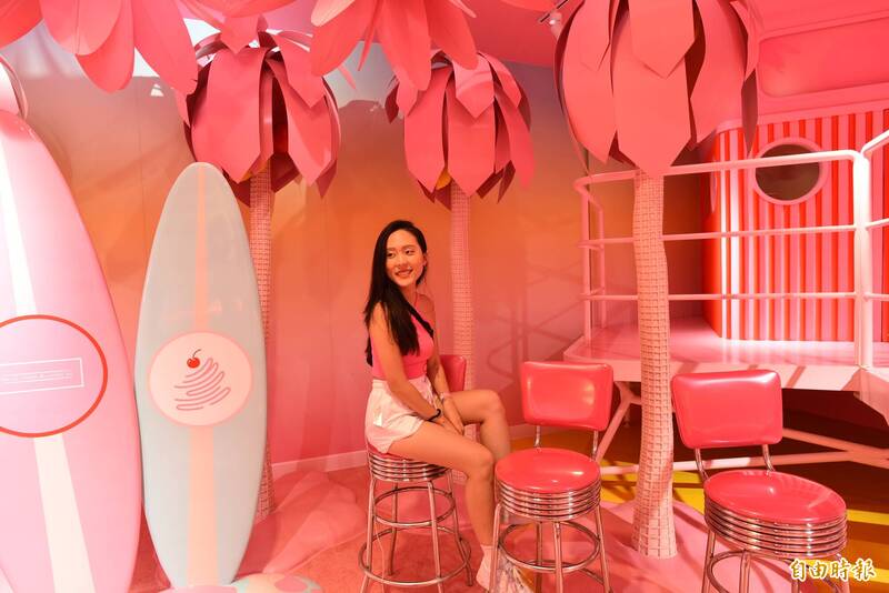 新加坡冰淇淋博物館設有14個體驗展場,並全由粉紅系配色,如沙灘就被粉紅風暴席捲,讓人少女心無限噴發,(記者吳柏軒攝)