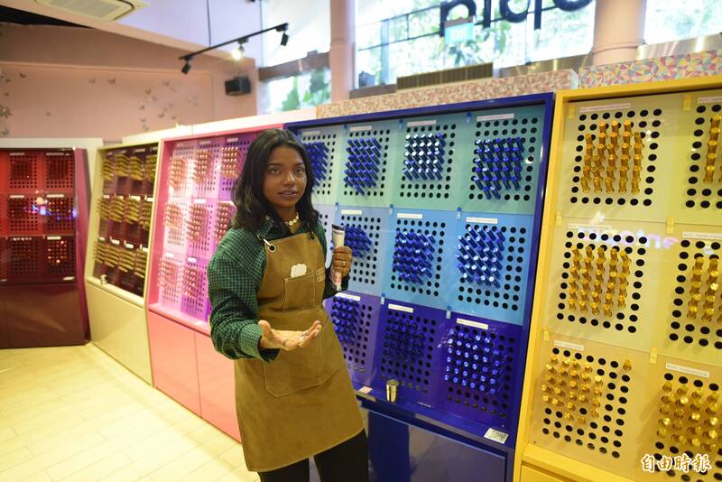 新加坡聖淘沙內開設「Sentopia」香水店設有香水體驗活動,可讓遊客從120種香味中挑選喜愛的味道來自製獨一無二的個人香水。(記者吳柏軒攝)