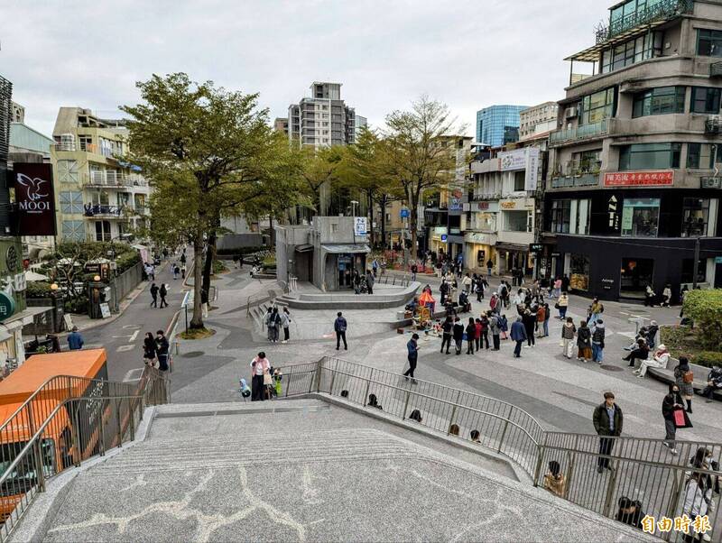 台北捷運中山站4號出口及周邊線形公園於2019年10月改造完成,平日有許多民眾駐足停留。(記者林承鴻攝)