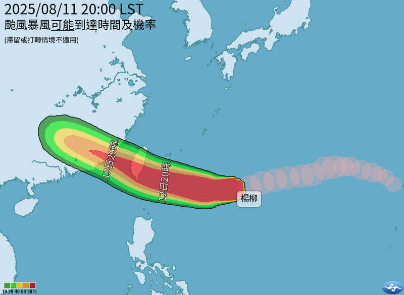 中度颱風楊柳暴風可能到達時間及機率。(取自中央氣象署官網)