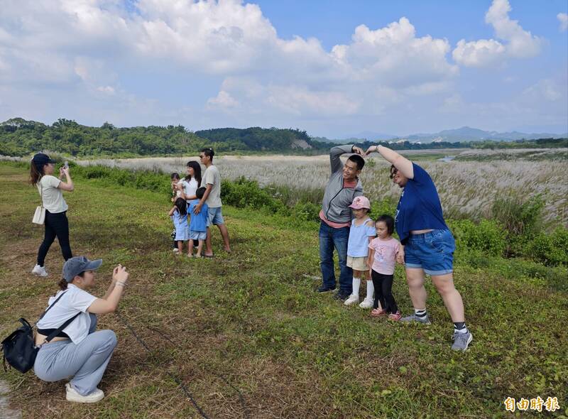 曾文溪畔甜根子草盛開,大內區公所舉辦「9月雪」活動,安排遊客與花海合影。(記者吳俊鋒攝)