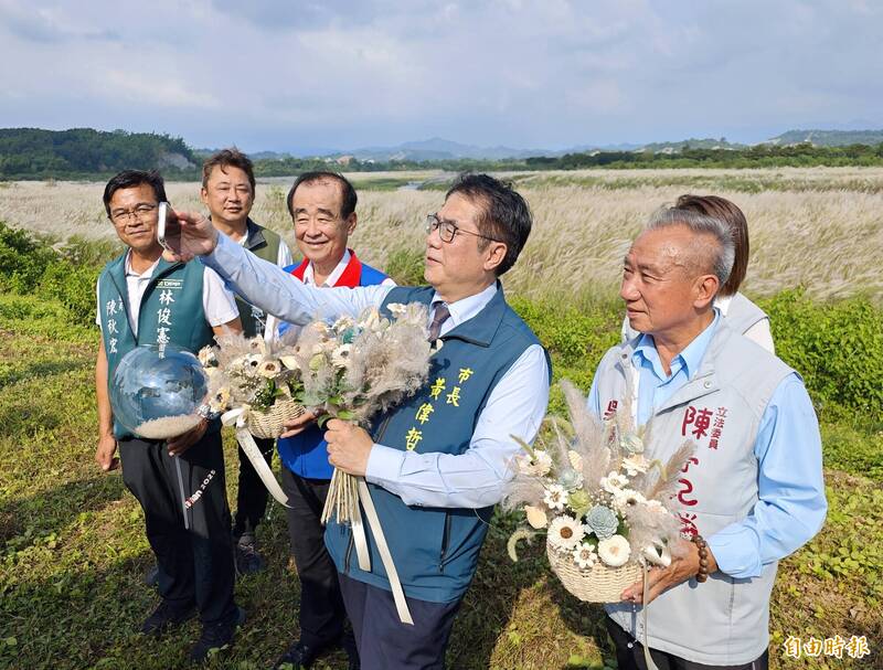 市長黃偉哲與各界貴賓也在甜根子草花海前自拍合影。(記者吳俊鋒攝)