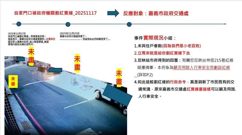 民眾投訴說,未獲通知參加會勘,去年11月17日突然發現門前被市府直接劃設紅線,然而對面住家前卻沒劃紅線,曾問里長,里長回市府要劃的,抨擊市府根本「選擇性劃線」、質疑欺壓百姓;自家不是位於轉彎處,且依「嘉義市政府狹小巷弄劃設及管理作業程序」,狹小巷弄定義是3.5至7公尺寬道路,該巷弄卻有8公尺寬,向市府陳情,市府僅說「顧及用路人行車安全而劃設紅線」未說明原因。