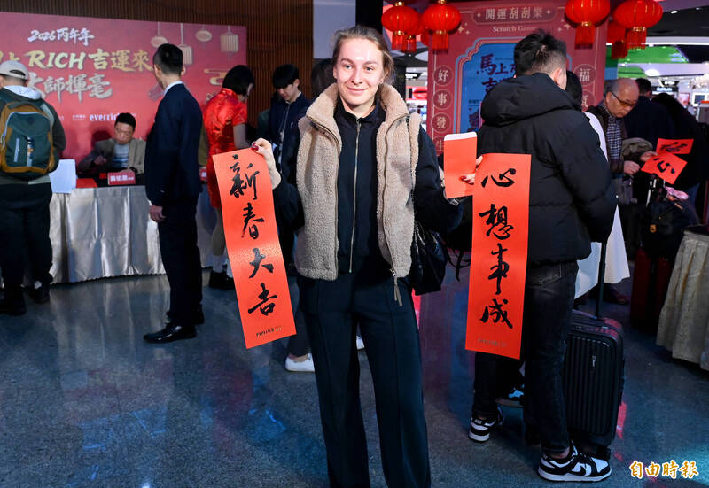 來台工作的俄羅斯旅客白莎莎說,來台居住已經一段時間,農曆春節已變成她生活的一部分,很開心可以在馬年用這樣的方式和大家一起慶祝新年。她特別請老師寫了「心想事成」及「新春大吉」,要帶回去送給親友貼在門口。
