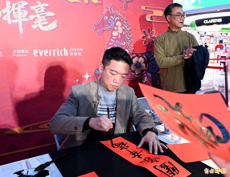昇恆昌免稅商店上午舉辦「馬上 RICH 吉運來」大師揮毫活動,邀請書法名家書寫春聯。(記者朱沛雄攝)