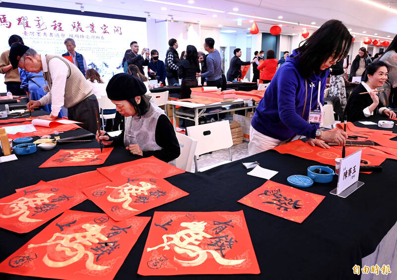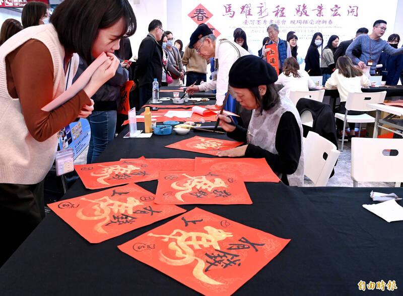 采盟免稅店下午於台灣好廣場舉辦「馬耀新程」迎春揮毫活動,台灣墨秀書道會師生即興揮毫寫春聯,贈送給民眾與旅客。(記者朱沛雄攝)