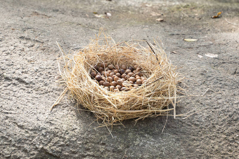 殼斗科的青剛櫟在野外是松鼠、飛鼠、野豬、黑熊等野生動物喜歡的食物,保育員特別用乾草裝著提供給黑熊。(台北動物園提供)