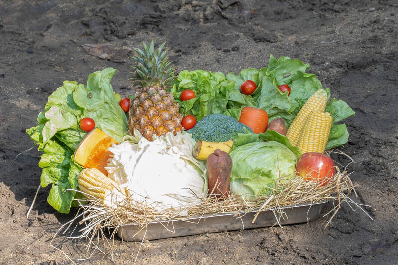 馬來貘的年菜盤有著高麗菜、萵苣、花椰菜、玉米、地瓜、蘋果、鳳梨等蔬菜水果。(台北動物園提供)