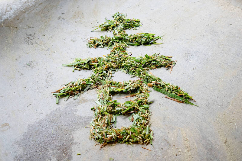 迷你馬與家驢的保育員以狼尾草在地上排出春字,加點生肖馬年應景趣味。(台北動物園提供)