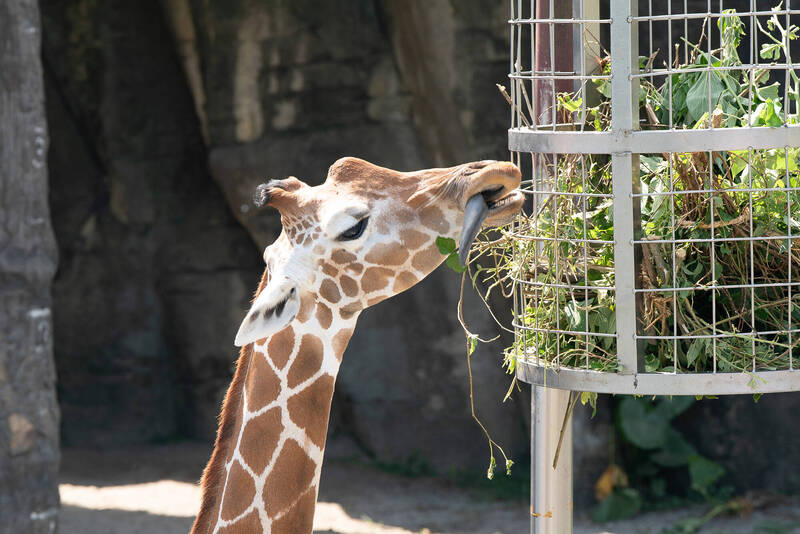 長頸鹿是典型的食葉性反芻動物,對於纖維的需求非常高,來源可以是各式不同種類的樹葉,反而不適合取食根莖類和水果。(台北動物園提供)