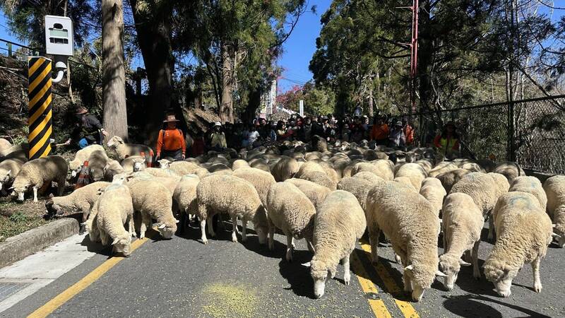 清境農場「奔羊節」熱鬧開衝,今年有115對綿羊,與大批遊客在台14甲線奔跑互動,場面相當熱鬧。(清境農場提供)