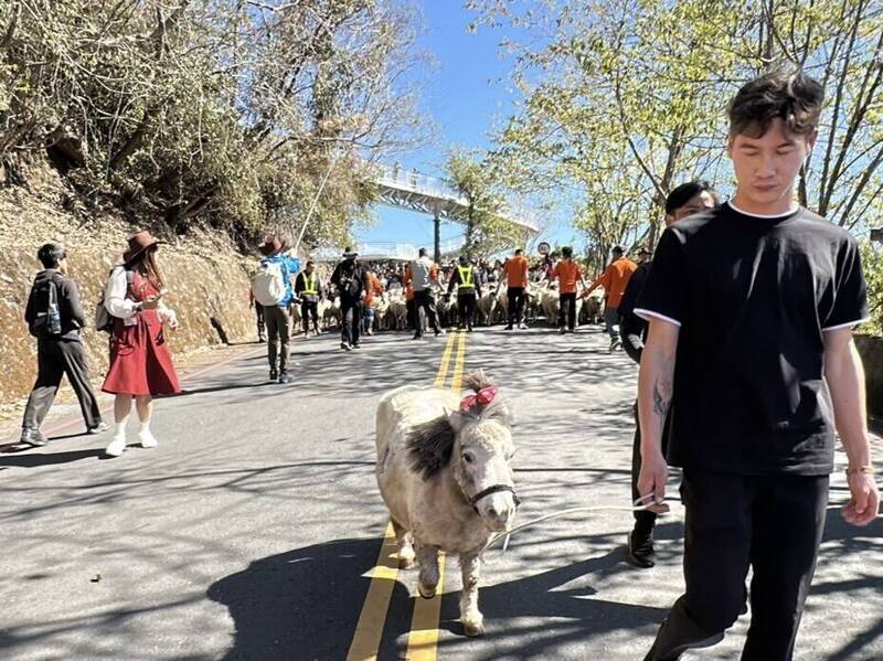 清境農場「奔羊節」登場,今年迎接馬年還由白馬率領羊群開跑。(清境農場提供)