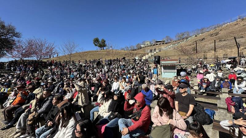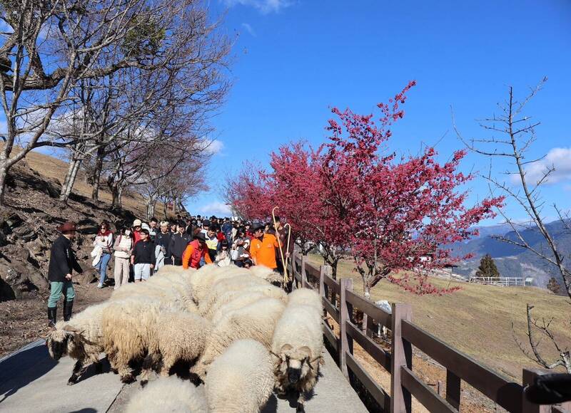 清境農場「奔羊節」登場,春節適逢場區櫻花盛開,民眾欣賞綿羊秀,還能一邊賞櫻。(清境農場提供)