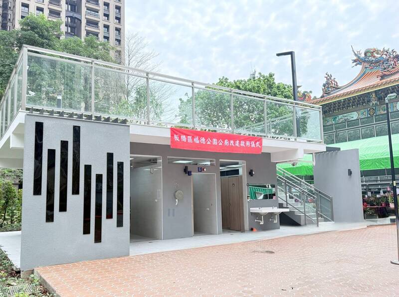 板橋區公所推動福德公園既有公廁拆除重建,即日起全新景觀公廁完工啟用。(板橋區公所提供)