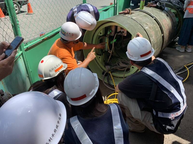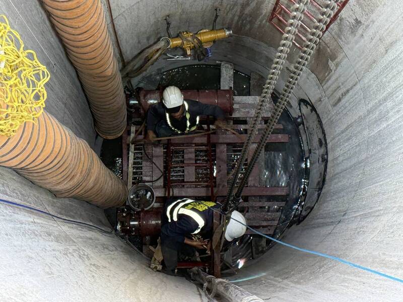新北市水利局施工人員在工作井中架設推進機台,以利後續推進作業。(新北市水利局提供)
