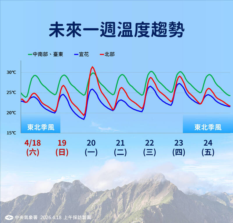 「下週三是未來一週天氣最好的一天,但下週四起天氣有很大變化」,曾昭誠說,下週四(23日)當天會有另一波鋒面通過,緊接著東北季風會增強,北部氣溫下降,而中部以北開始有短暫陣雨或雷雨,南部、東北部及東部有局部短暫陣雨或雷雨,東南部也有局部短暫陣雨。
