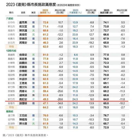 2023縣市長施政滿意度 蔣萬安墊底 謝國樑、高虹安倒數二、三