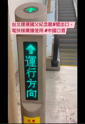 台北市議員簡舒培接獲民眾反映,行經台北市捷運板南線國父紀念館站5號出口、靠近大巨蛋的手扶梯時,聽到中國用語及口音廣播「電梯正在運行」,質疑「台北市已經被中共包圍了」。(取自台北市議員簡舒培臉書粉絲專頁)