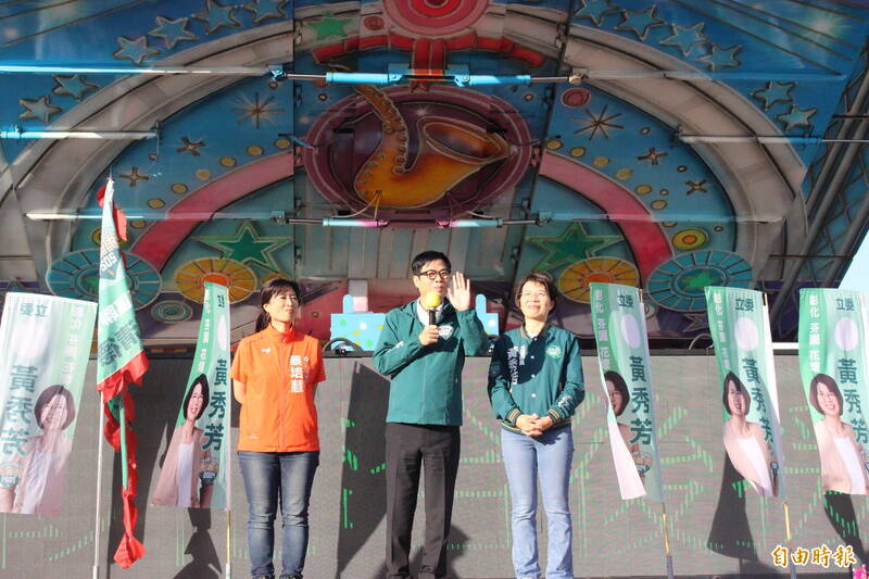 民進黨總統參選人賴清德與爭取連任的立委參選人黃秀芳西區聯合後援會,今天下午在彰化市成立,高雄市長陳其邁(中)站台輔選,呼籲大家不要管藍白合,堅定支持賴清德,同時也讓黃秀芳(右)、蔡培慧(左)雙雙當選,繼續推動彰化、南投的建設。 (記者張聰秋攝)