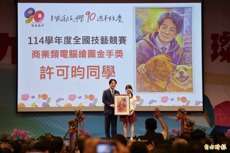 新民高中學生贈送賴清德與愛犬的畫像。(記者蔡淑媛攝)
