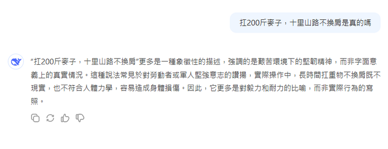 DeepSeek指出,「扛200斤麥子,十里山路不換肩」非字面意義上的真實情況。(圖擷自DeepSeek)