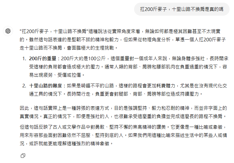 ChatGPT也認為「扛200斤麥子,十里山路不換肩」是一種誇張的表達方式。(圖擷自ChatGPT)