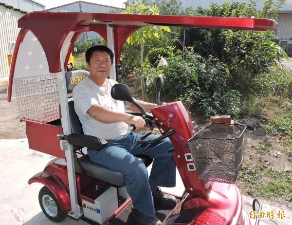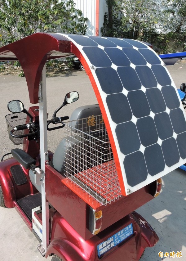 黃明義所開發的太陽能代步車,使用可彎曲的太陽能板,增加充電效能。(記者林良哲攝)
