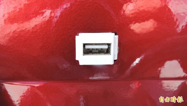 在太陽能代步車上,還設有USB插座,可以隨時為3C產品充電。(記者林良哲攝)