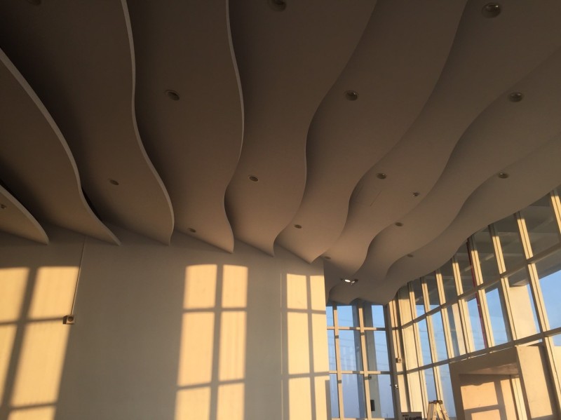 彰化縣城觀處長馬英傑表示,俗稱「白色海豚屋」的生態教育中心,這次開放的一樓空間,「海波浪」的天花板非常獨特,運用矽酸鈣板來做出波浪造型,呈現白浪的層次感。