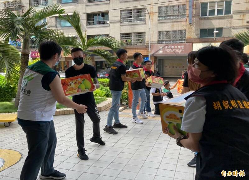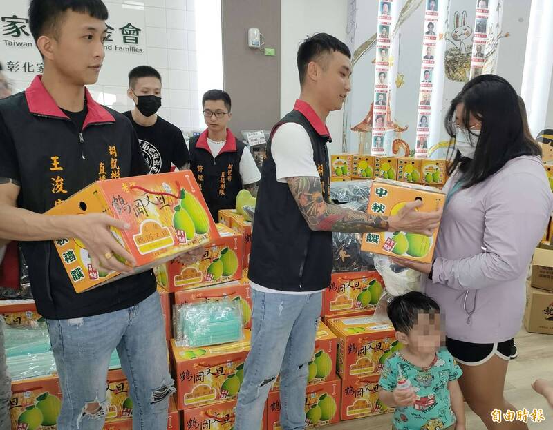 彰化家扶中心老朋友的直播主胡凱彬(右2)等人今天在中秋節前夕送來454箱柚子,愛心滿滿。(記者湯世名攝)